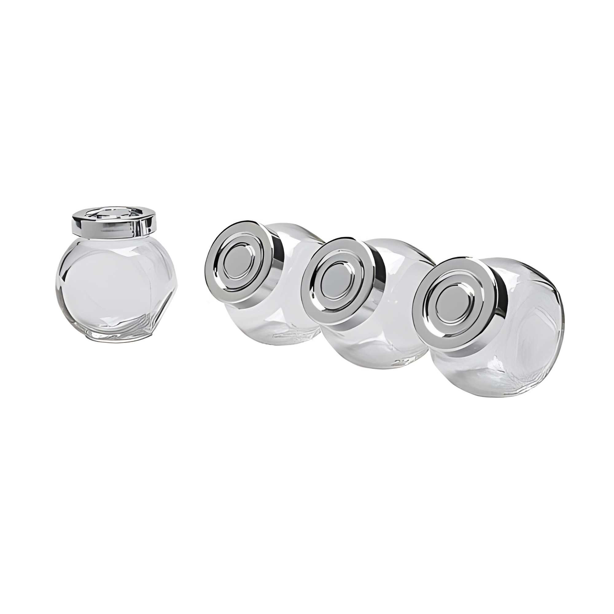 This set of 4 glass spice jars with sleek metal lids is perfect for storing and displaying your spices. Transparent design for easy visibility, airtight seal for lasting freshness, and versatile storage – upright or sideways